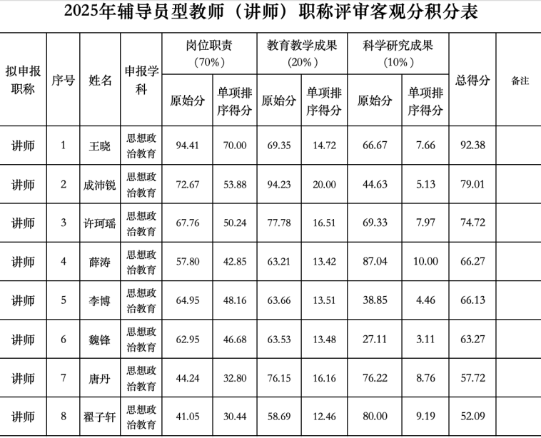 根据《安康学院专业技术职务评审工作实施办法(修订)》(校党发〔2024〕57号)和《安康学院辅导员型(含心理健康教育专职)教师岗位讲师职称评审实施细则(修订)》(学字〔2025〕10号),经个人申报,学工部专业技术职务评审工作组组织专家评审,现将符合本年度讲师职称申报资格的人员量化客观分积分和申报材料予以公示。