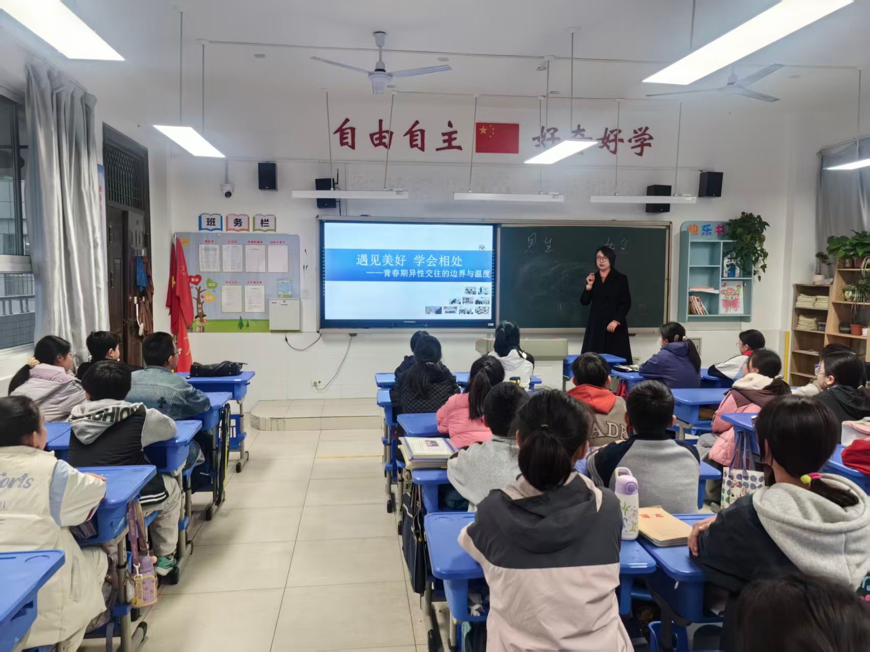 课程由我校心理中心专职教师、国家二级心理咨询师唐明宇主讲,主题为“遇见美好,学会相处——青春期异性交往的边界与温度”。唐老师以轻松活泼的“真情对视一分钟”互动游戏开场,有效缓解了学生对青春期话题的紧张与羞涩。随后,她围绕“青春期异性交往的变化”“交往边界的把握”以及“温和相处的小技巧”等内容,结合案例分析、情景模拟和小组讨论等多种形式,生动阐释了青春期交往中的常见困惑与应对方法。