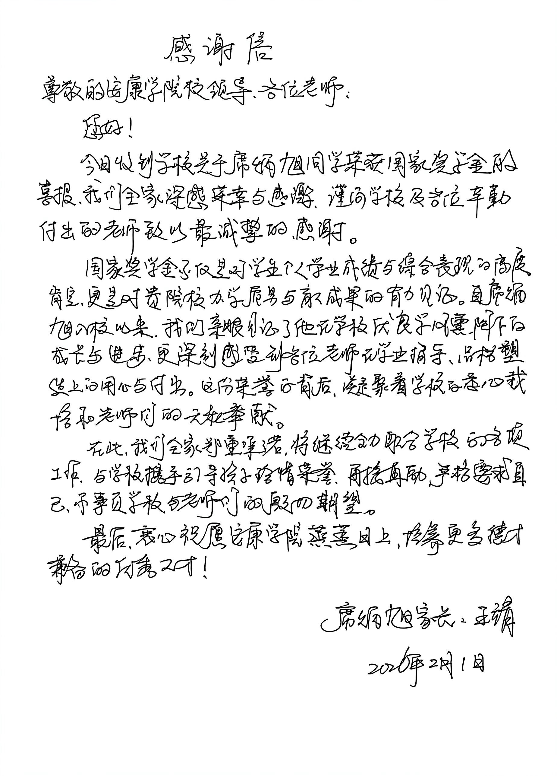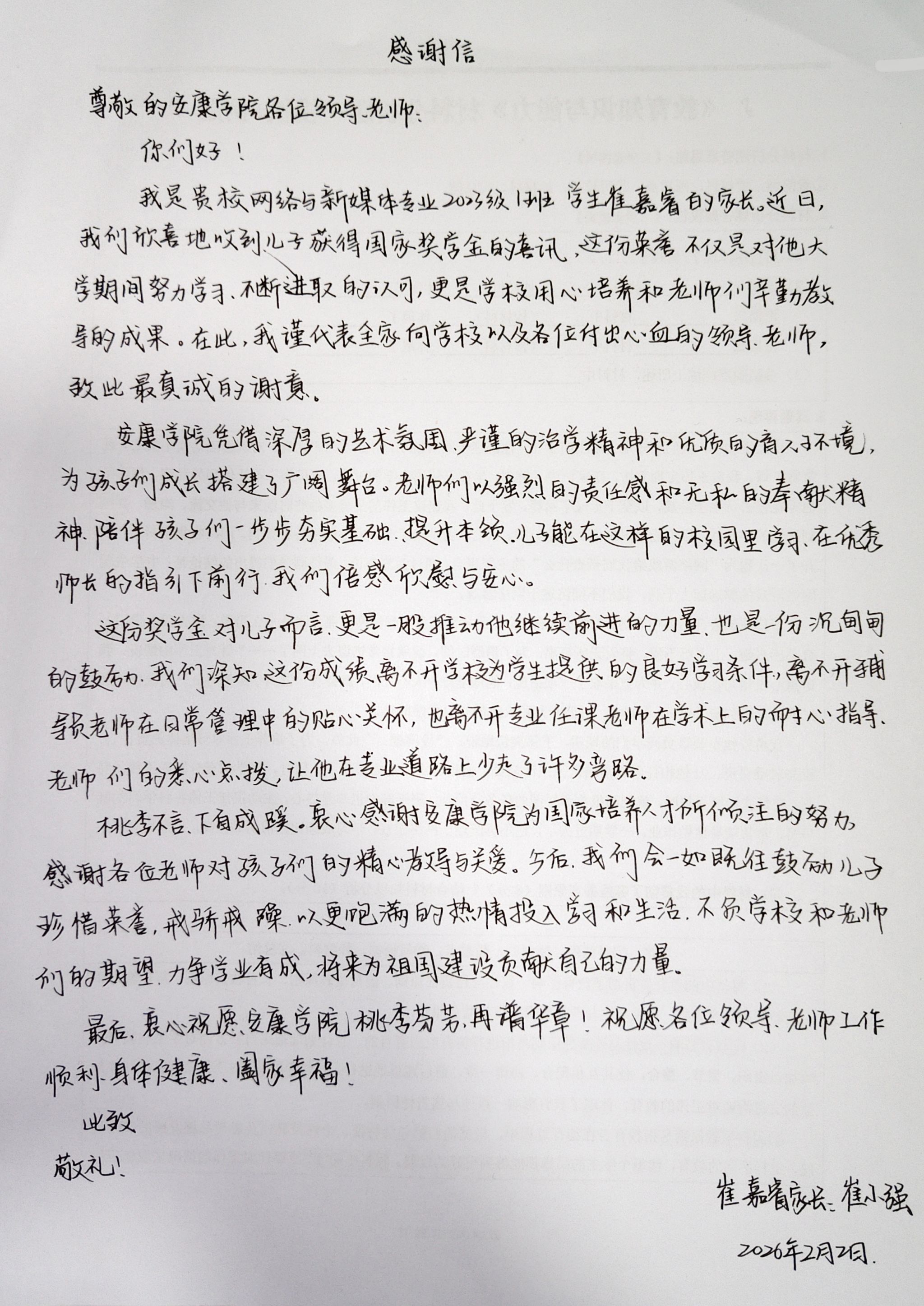 以喜报为纽带,学校向家庭传递学子在校的优异表现,既树立了学风标杆,也凝聚了家校育人共识。未来,学校将始终坚守立德树人根本任务,持续深化资助育人体系建设,将资助、服务、育人贯穿学生成长全过程,推动关爱精准传递,把对学生的关怀融入日常,助力广大学子锚定人生航向、积蓄前行力量,引导青年学子在新时代奋力奔跑,书写无愧于梦想、无愧于家国的青春答卷。
