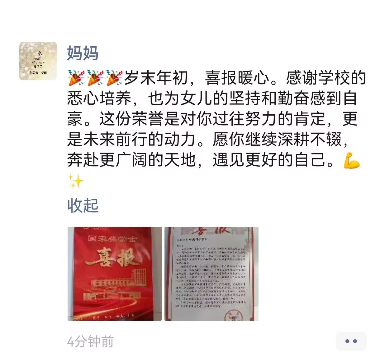 喜报寄达后,家长们倍感惊喜,纷纷通过朋友圈、拍照合影、致信感谢等方式,表达对学校悉心栽培与暖心关怀的感激之情。一位家长激动地表示:“感谢学校的悉心培养和老师的辛勤付出!这份沉甸甸的荣誉,让我们全家倍感骄傲与欣慰!”